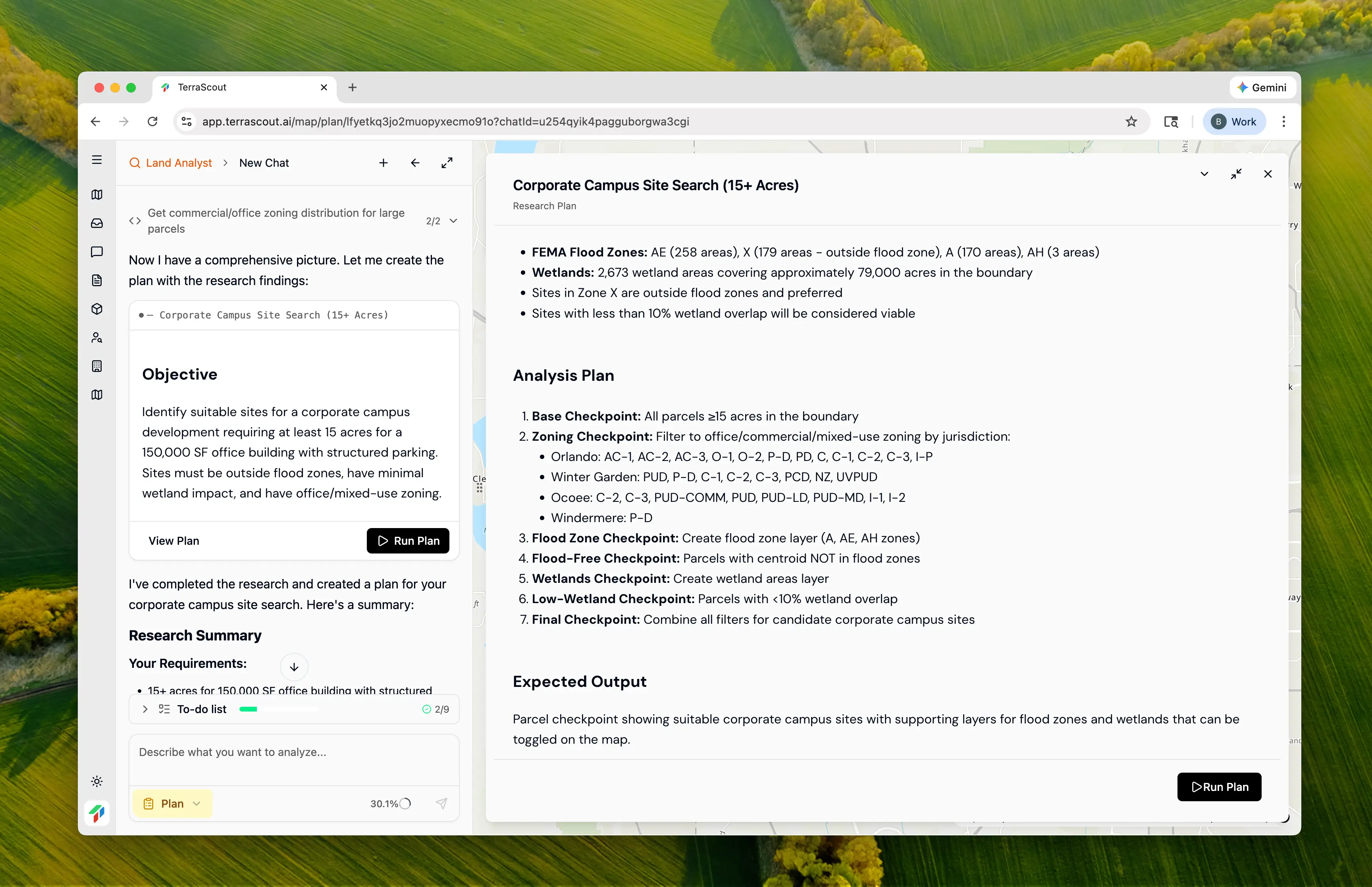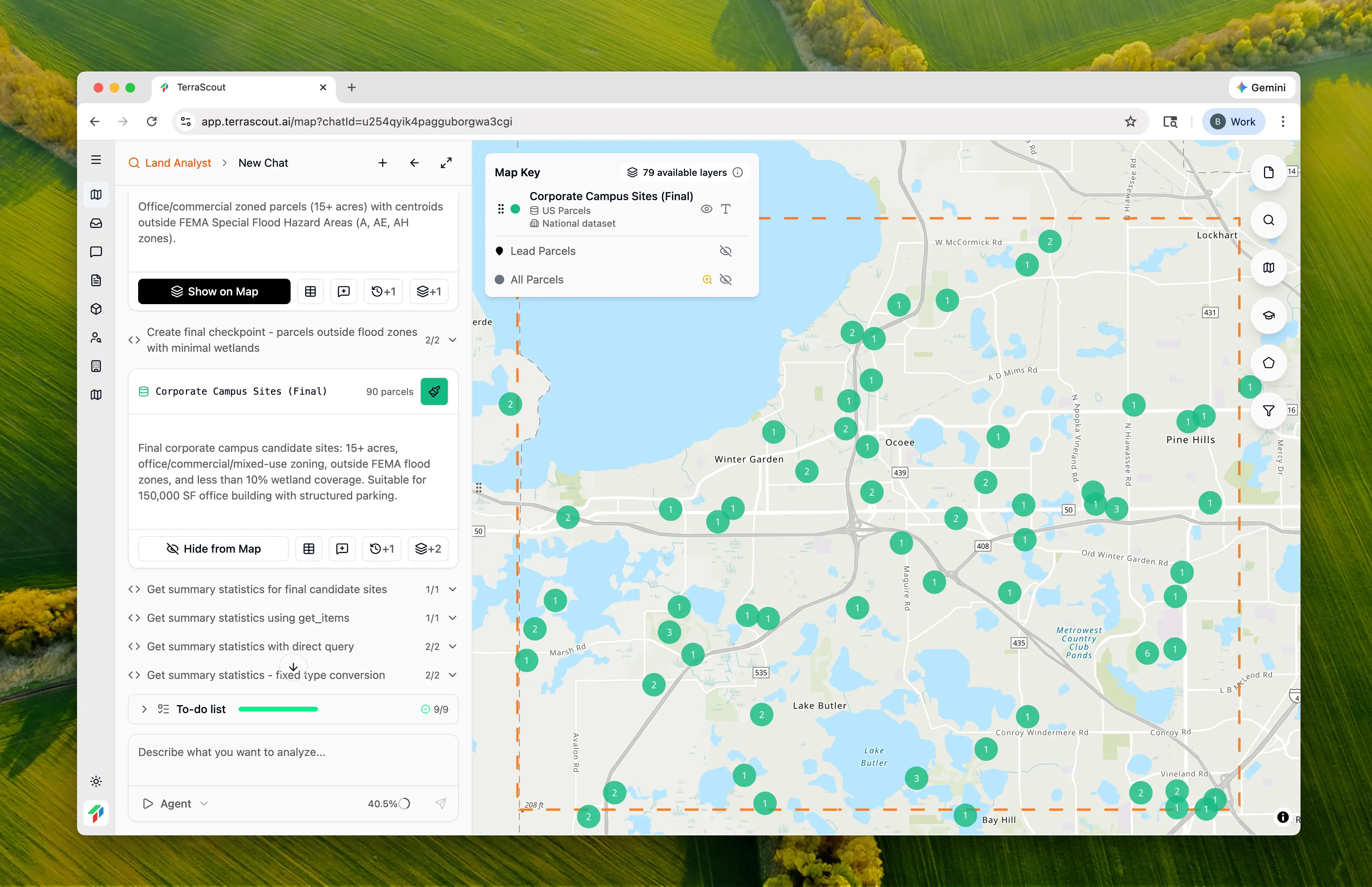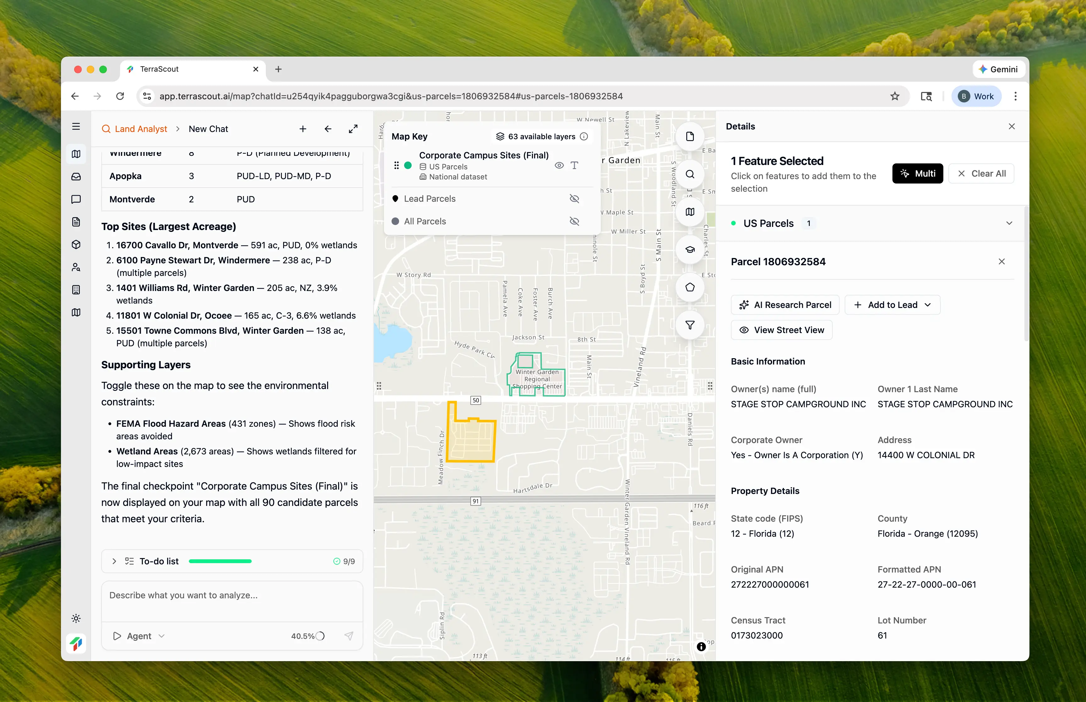 Sort by acreage and show the top 10 with owner informationGet contact details for outreach. Each refinement builds on the work already done—the agent remembers the zoning research and environmental screening.