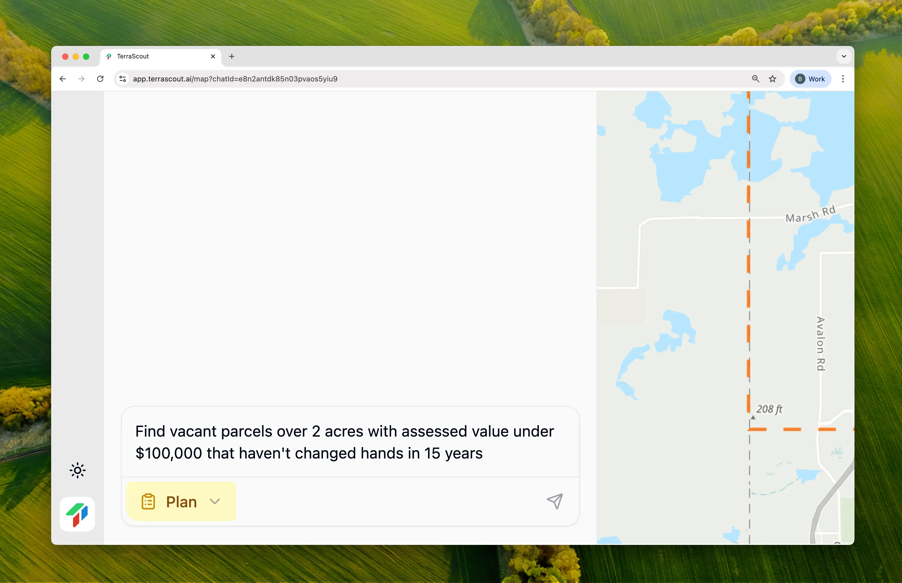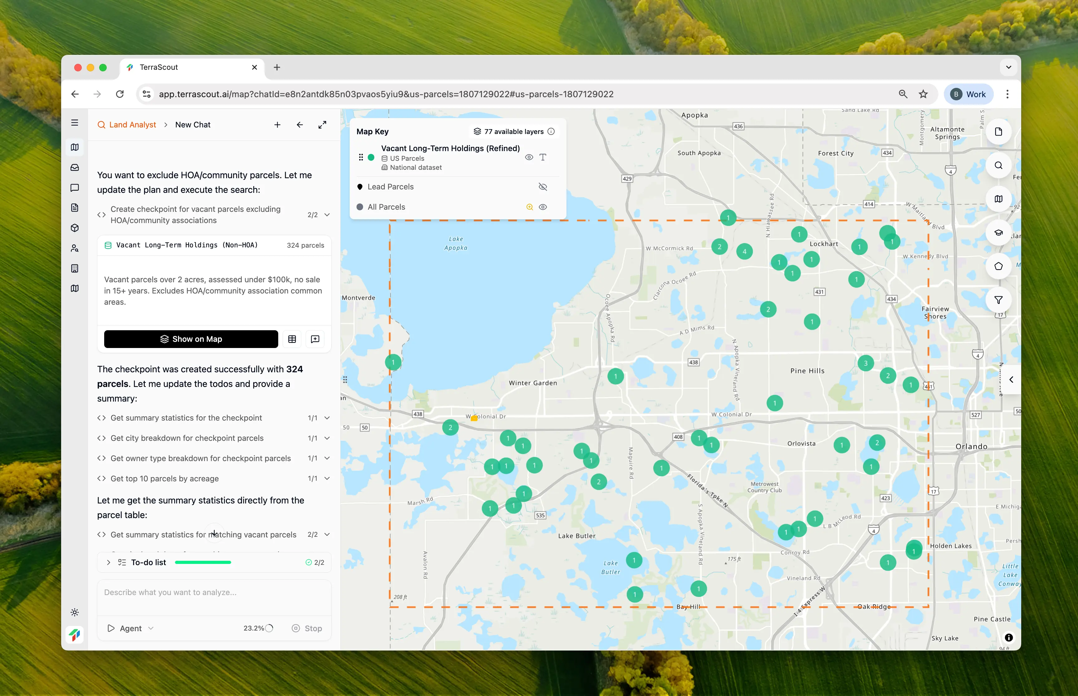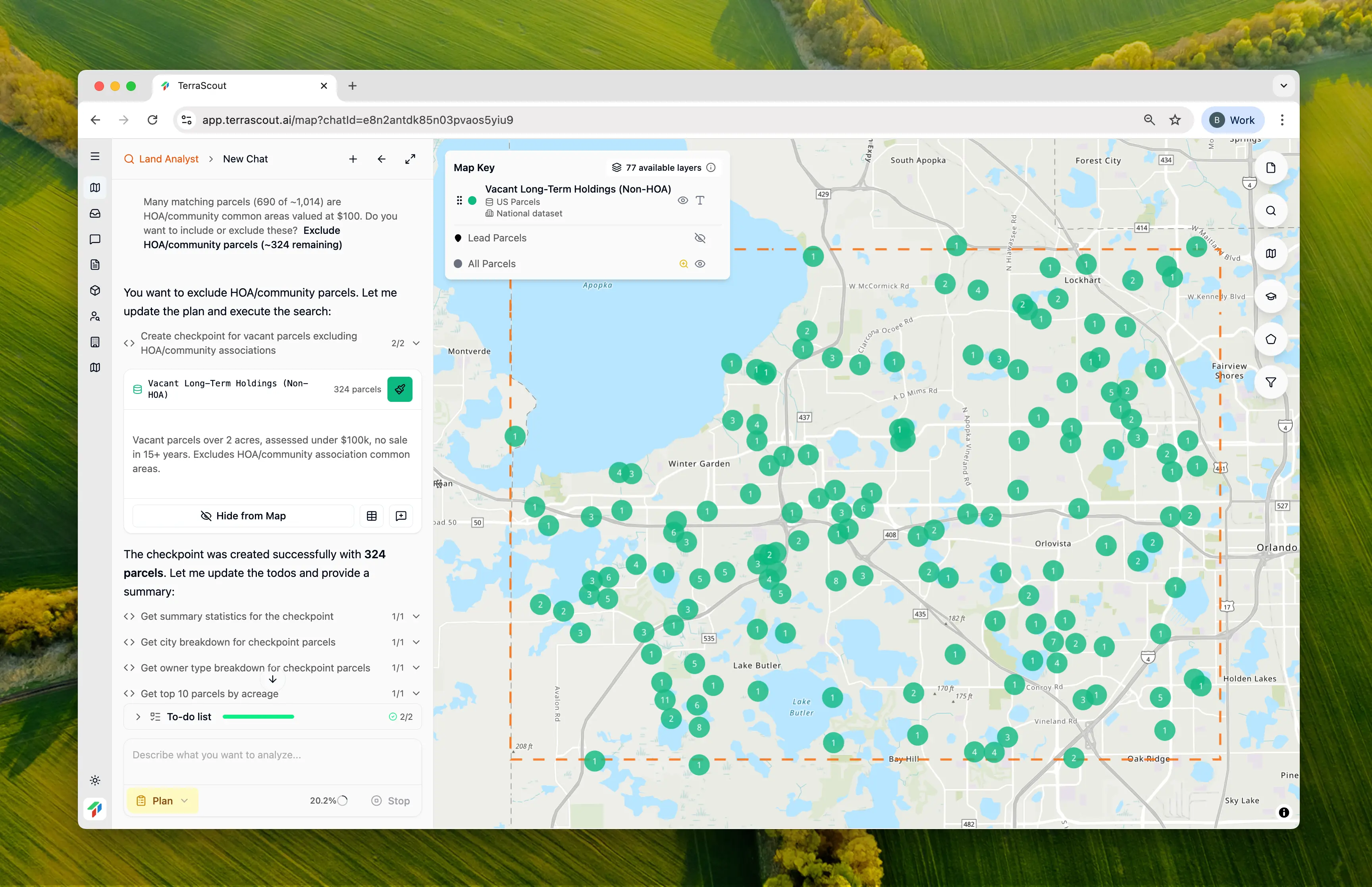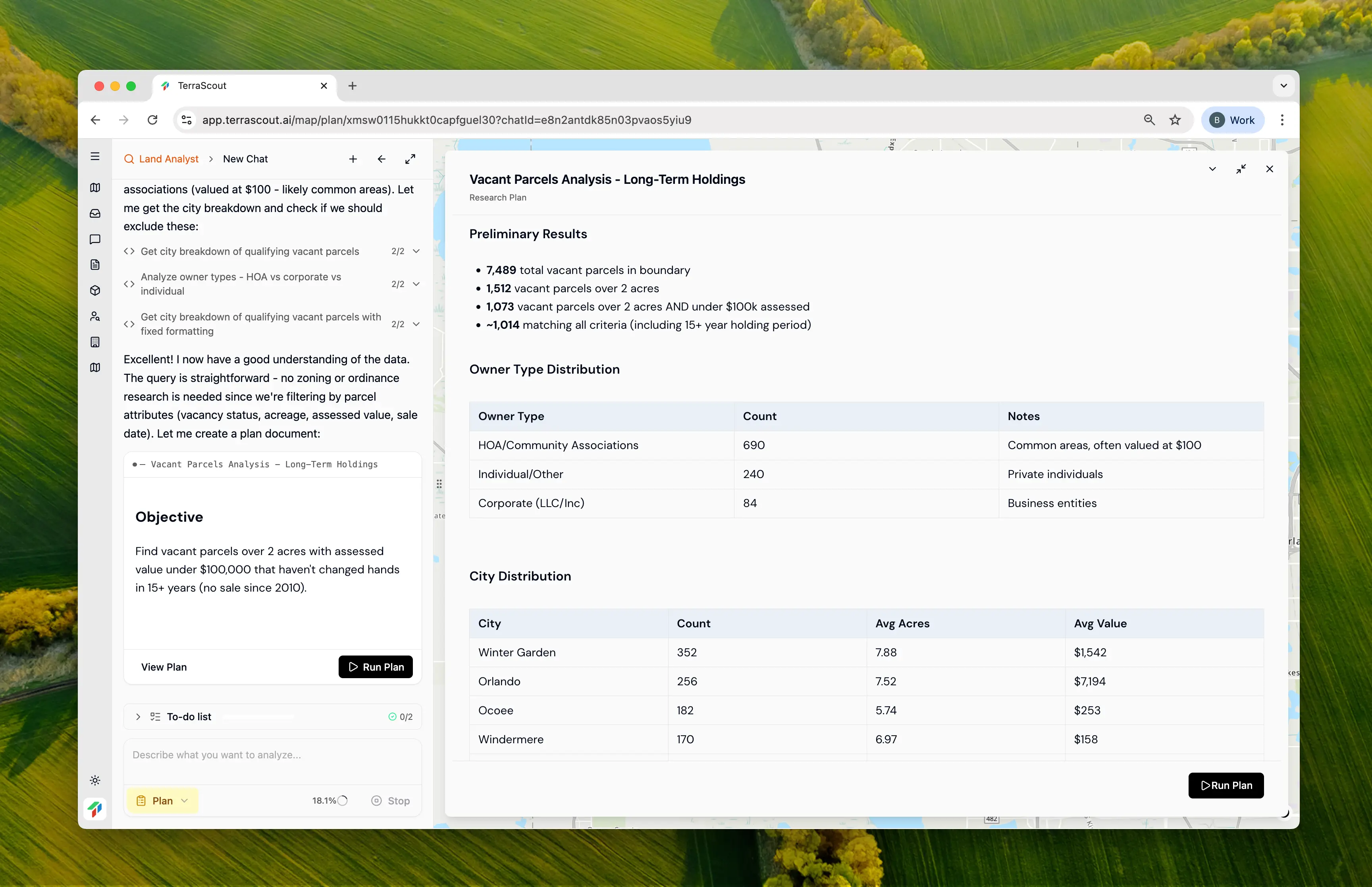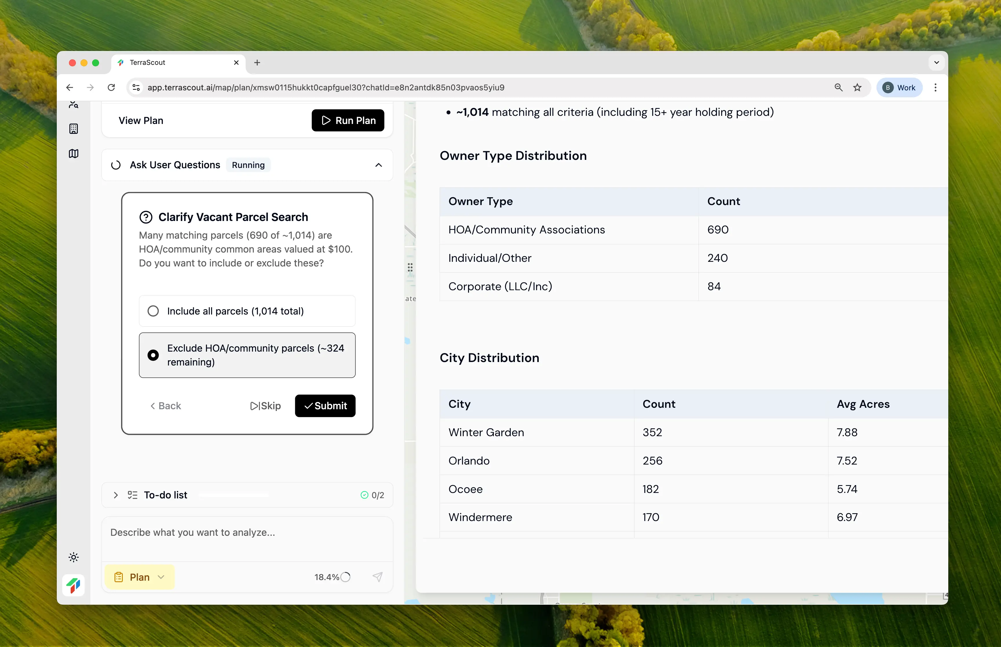 Ploti analyzes your request and creates a plan. It found ~1,014 matching parcels, but noticed something important: