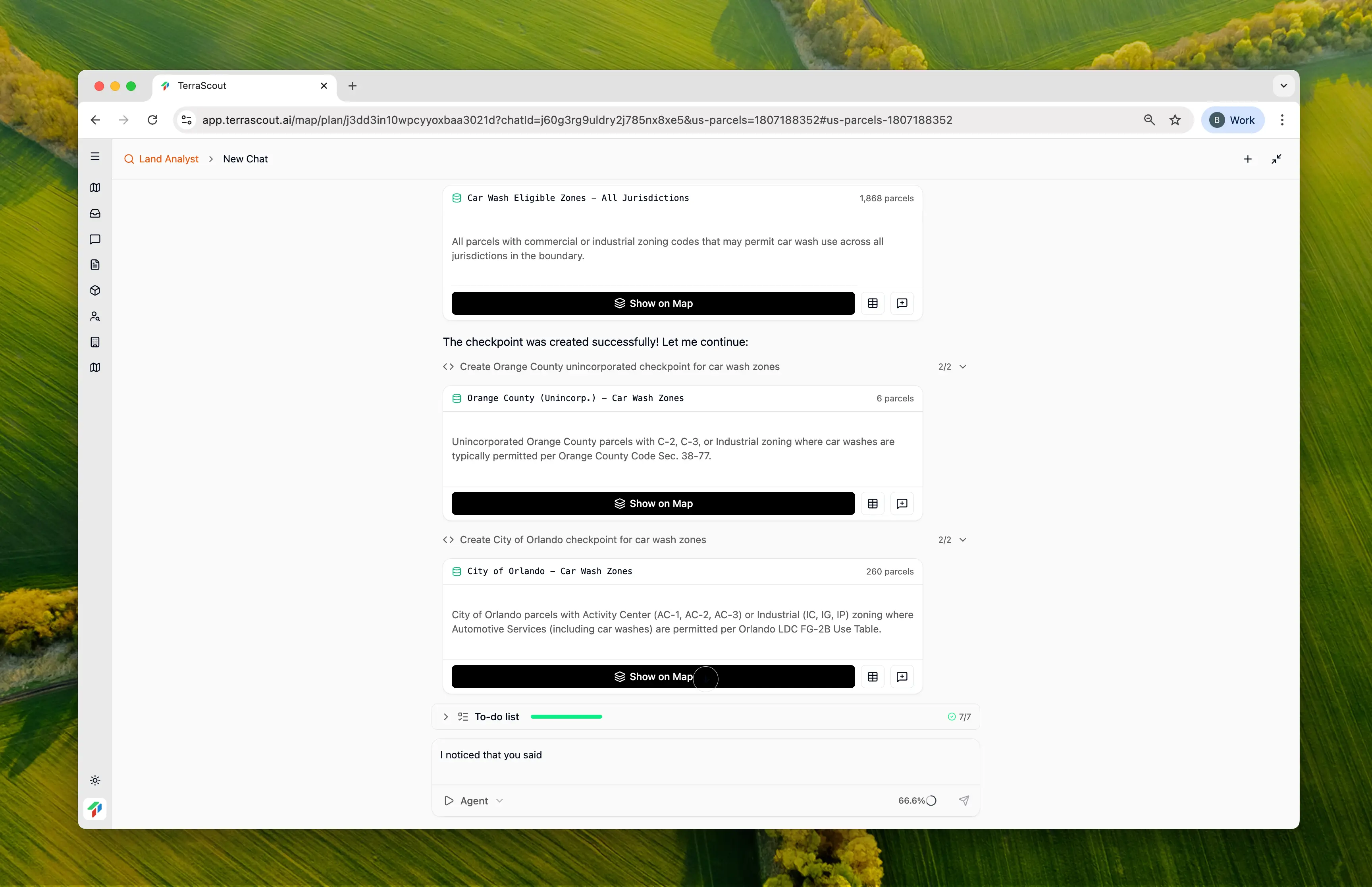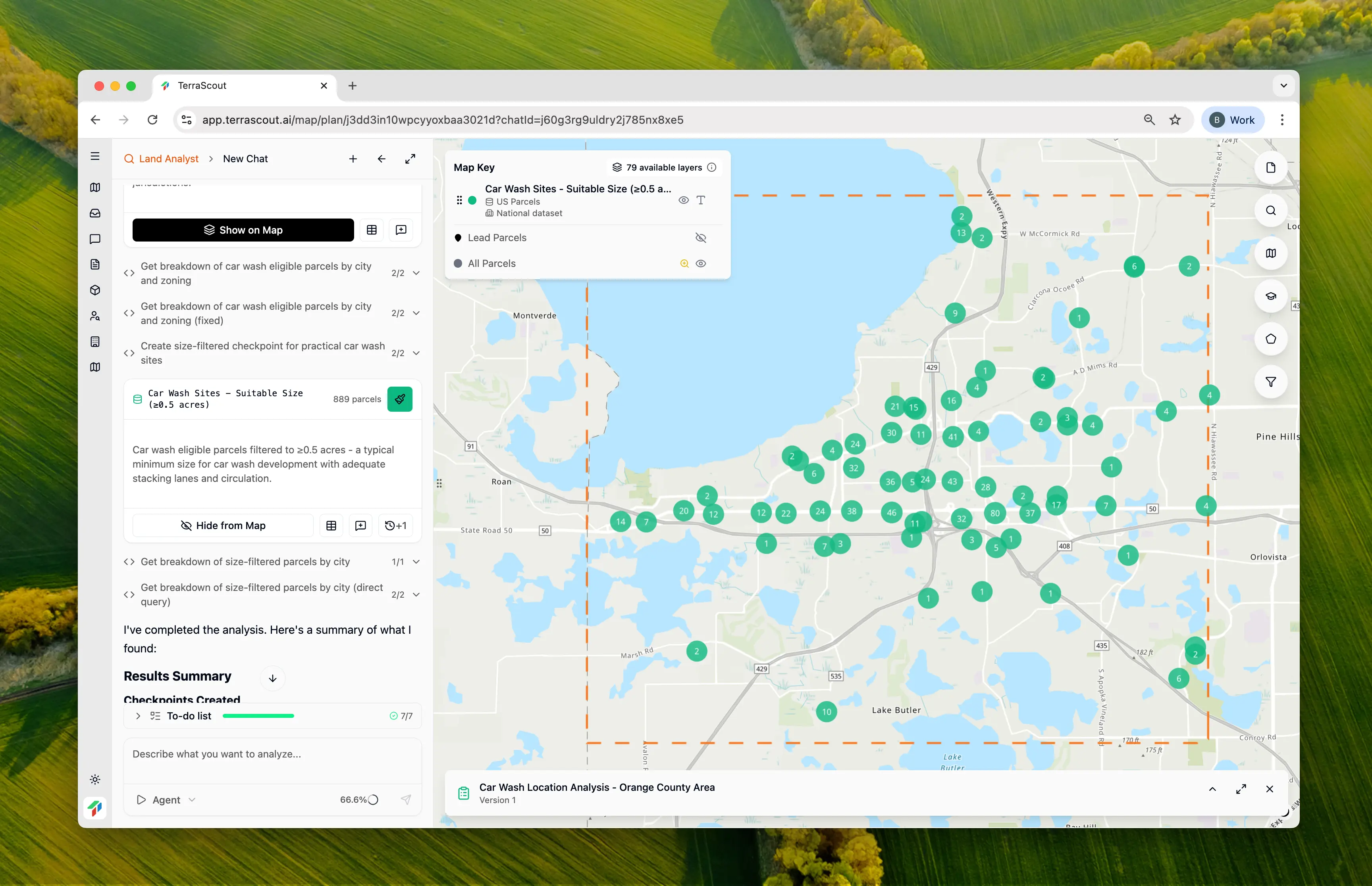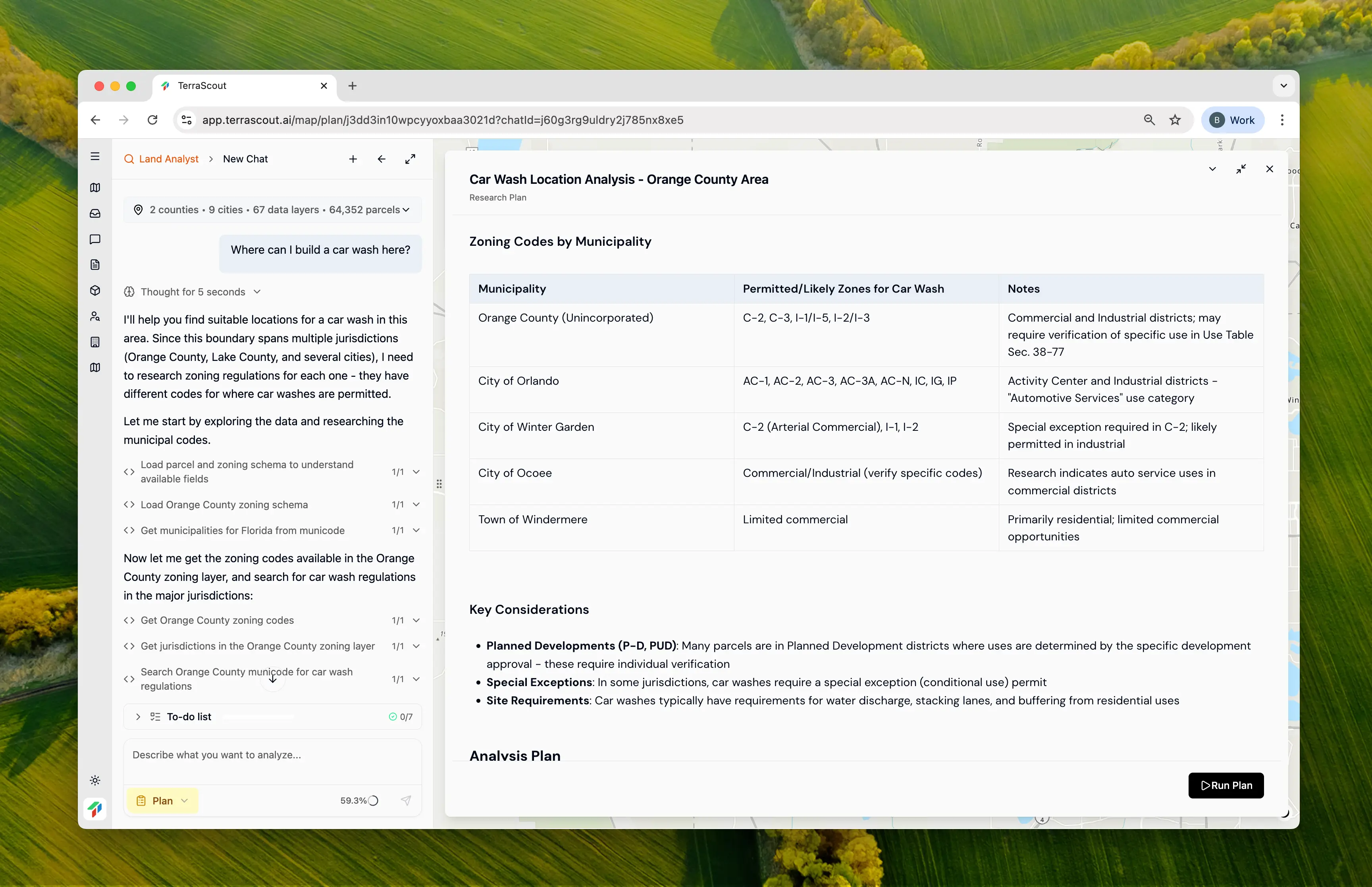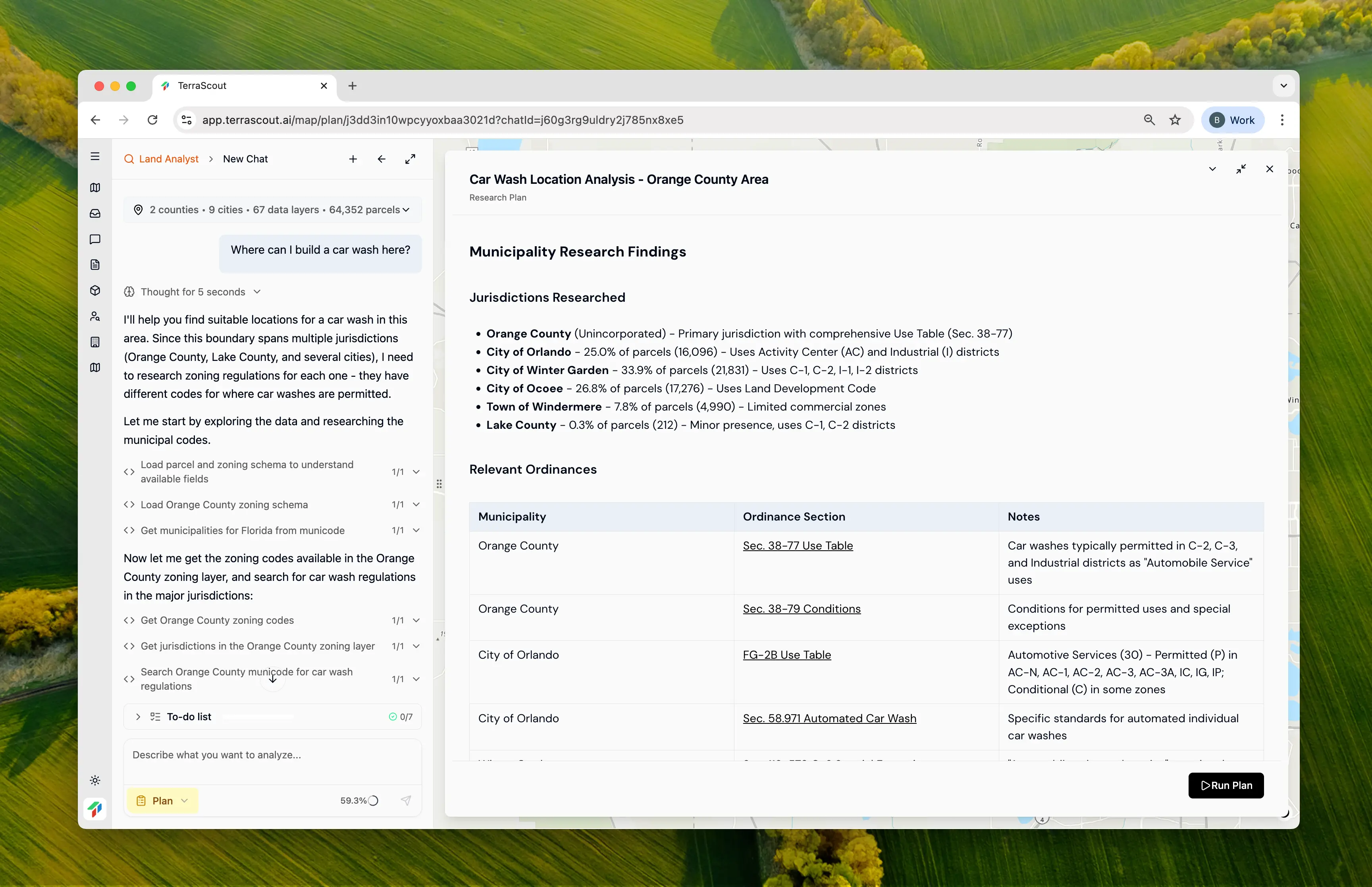 Sort by lot size and show me the top 20Each refinement builds on the ordinance research you’ve already done. The agent remembers that these parcels are in car-wash-permitted zones—you don’t have to re-explain. This is the workflow: Start with regulatory screening, then layer on site criteria through conversation. What would take weeks of back-and-forth with consultants happens in a single session.
