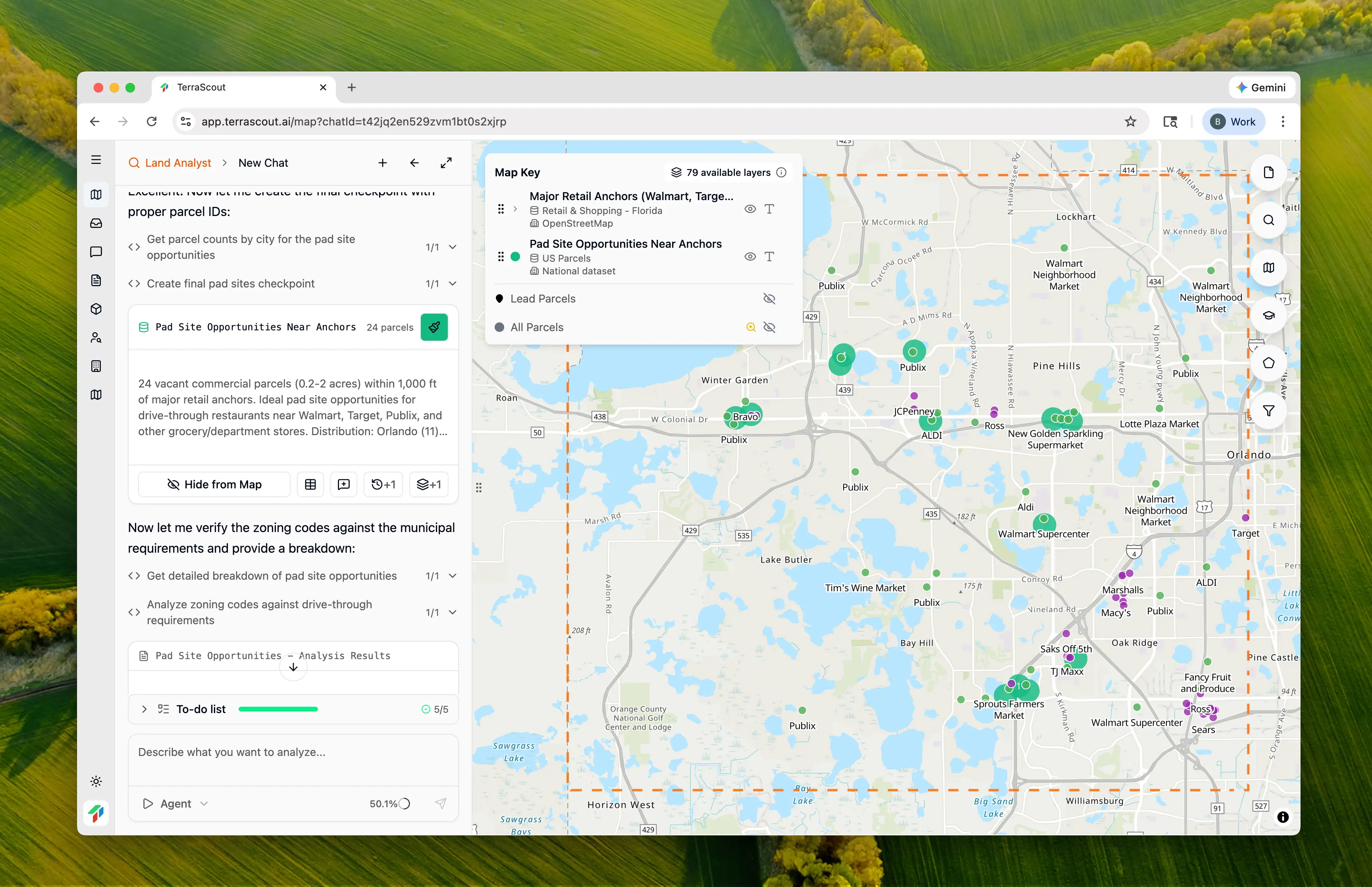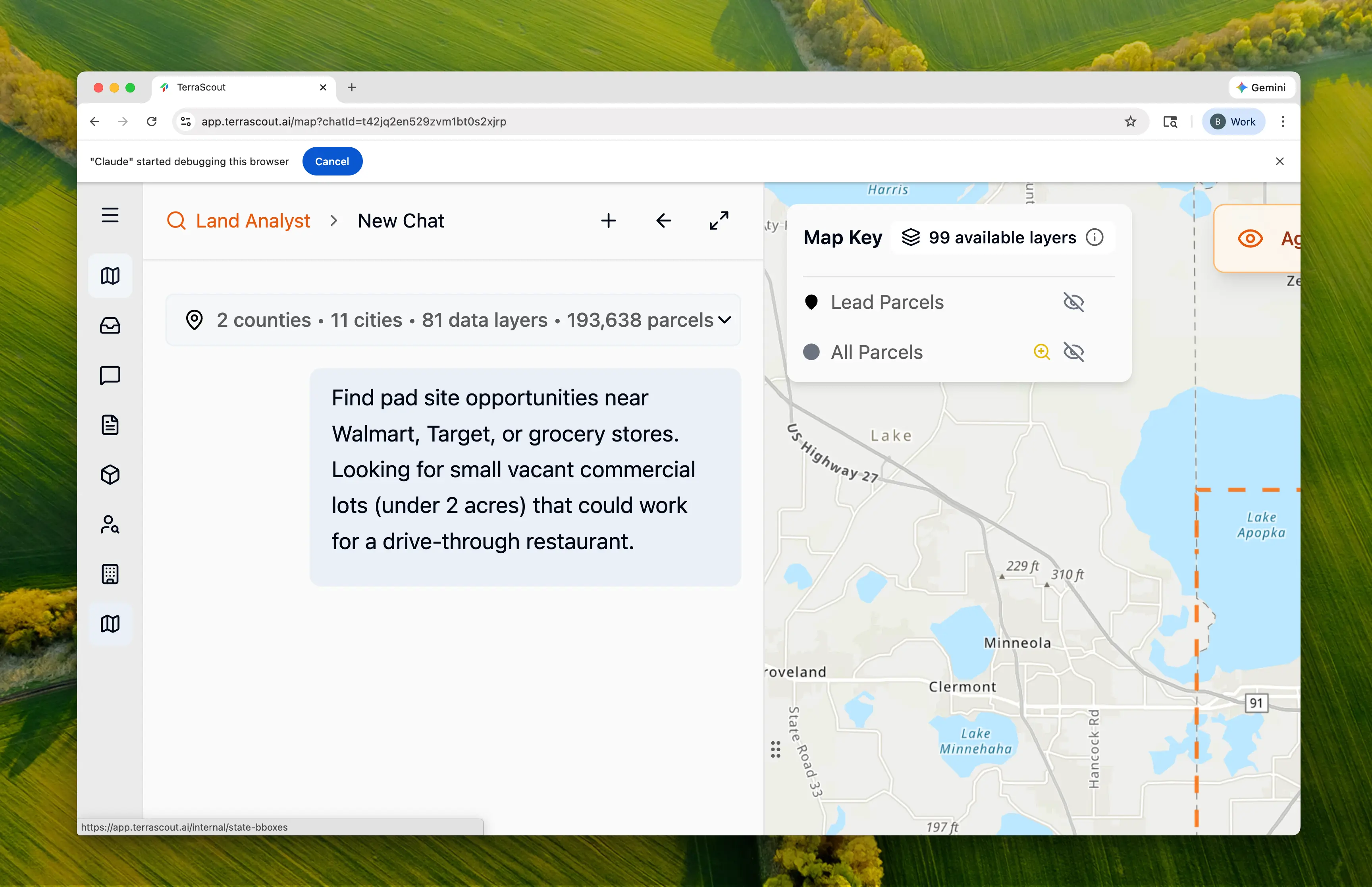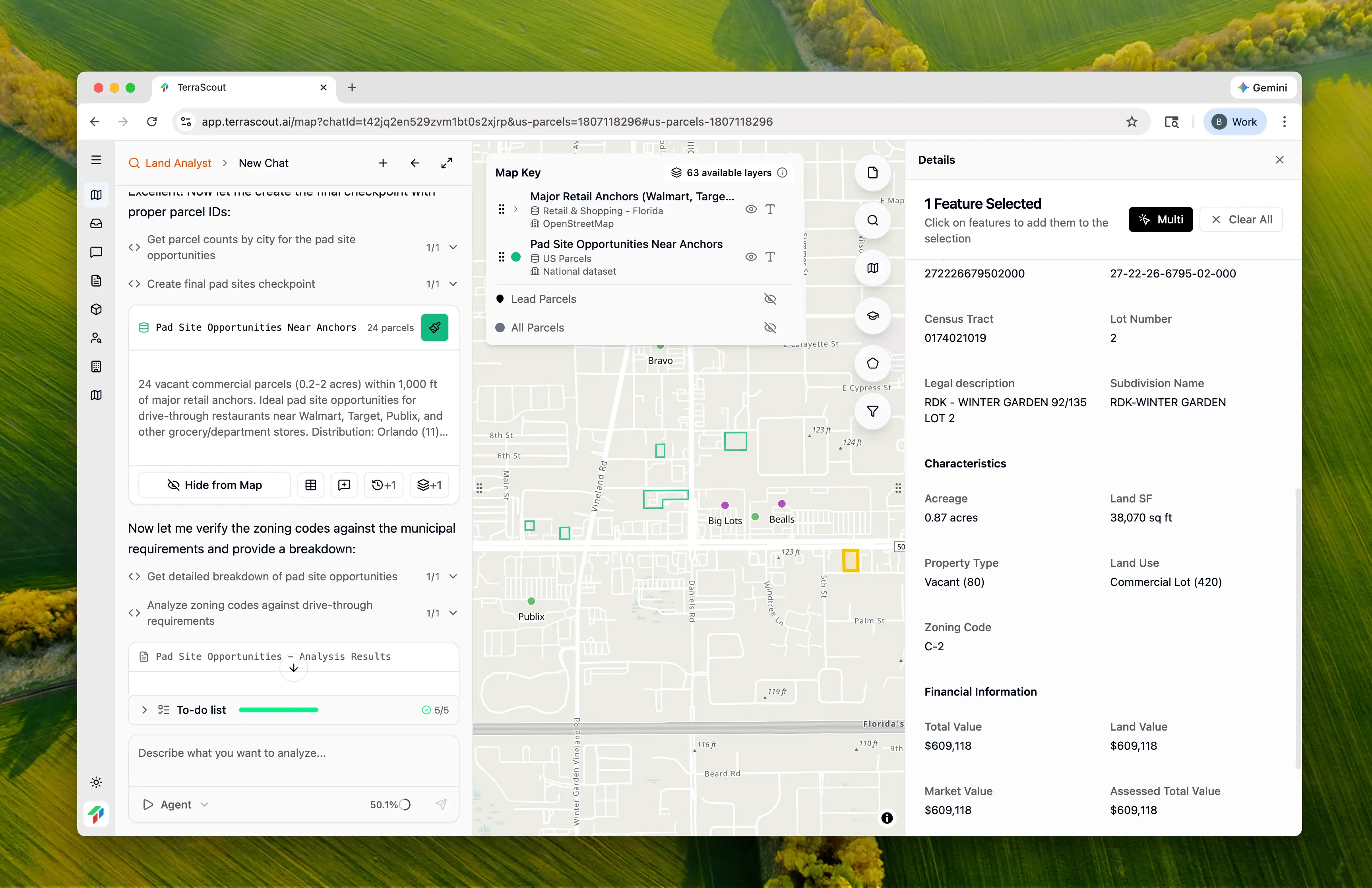 - Small parcel filtering — Focused on pad-appropriate sizes (0.2-2 acres)
