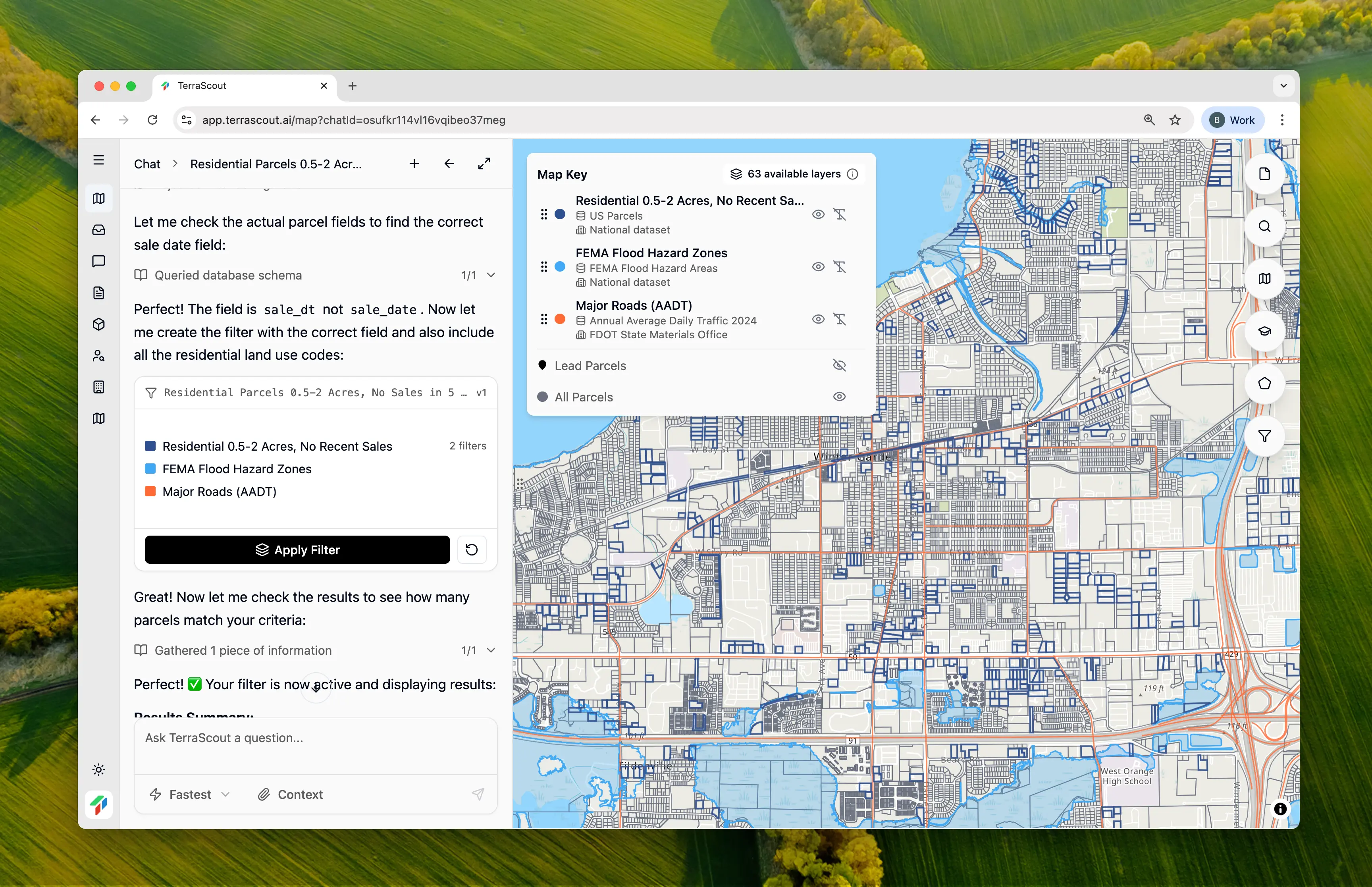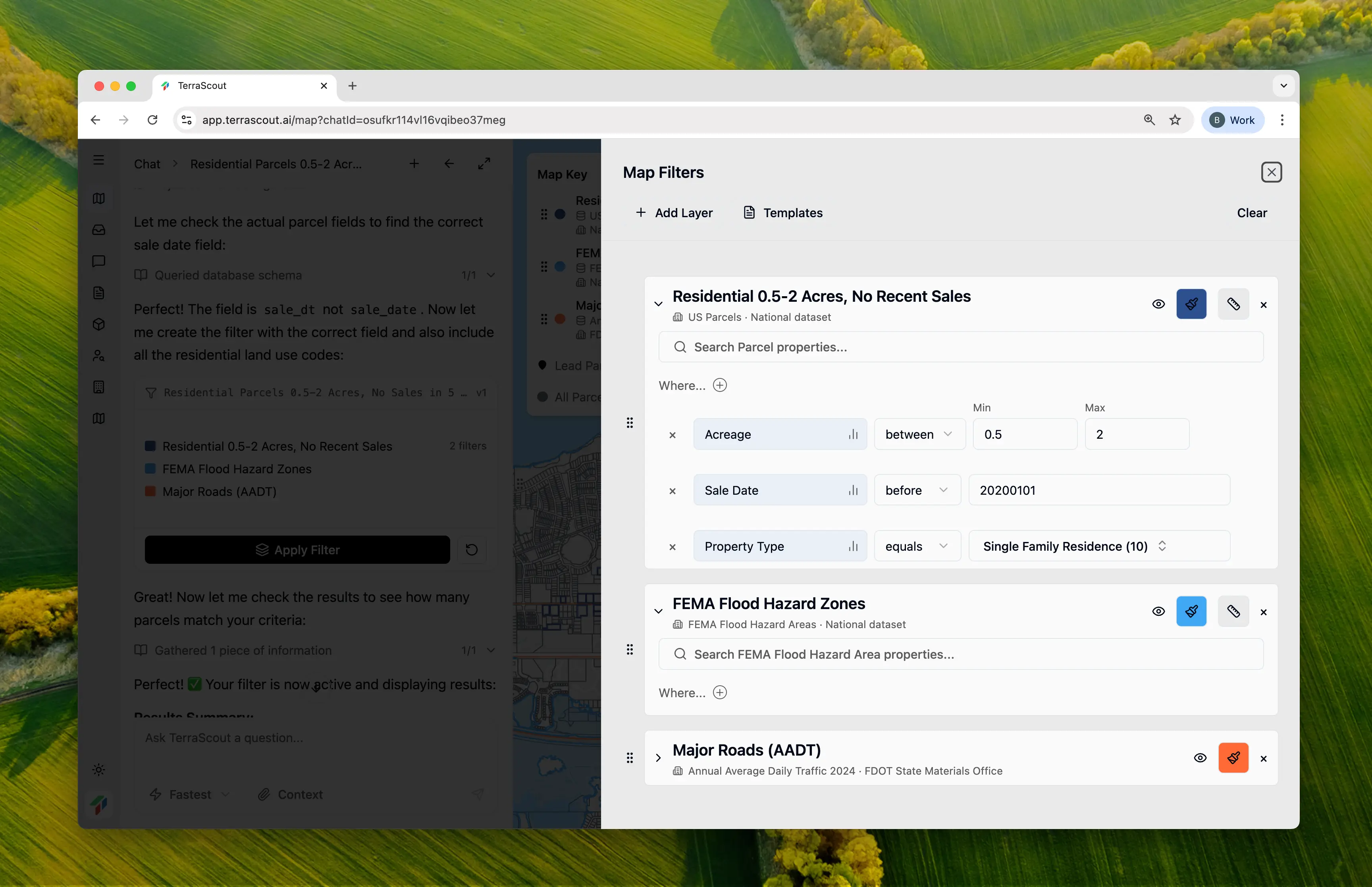 Each area on the map has different data layers available. When you ask Ploti to show you something, it checks the available layers and creates the appropriate filter.- “Show me residential parcels over 5 acres”
