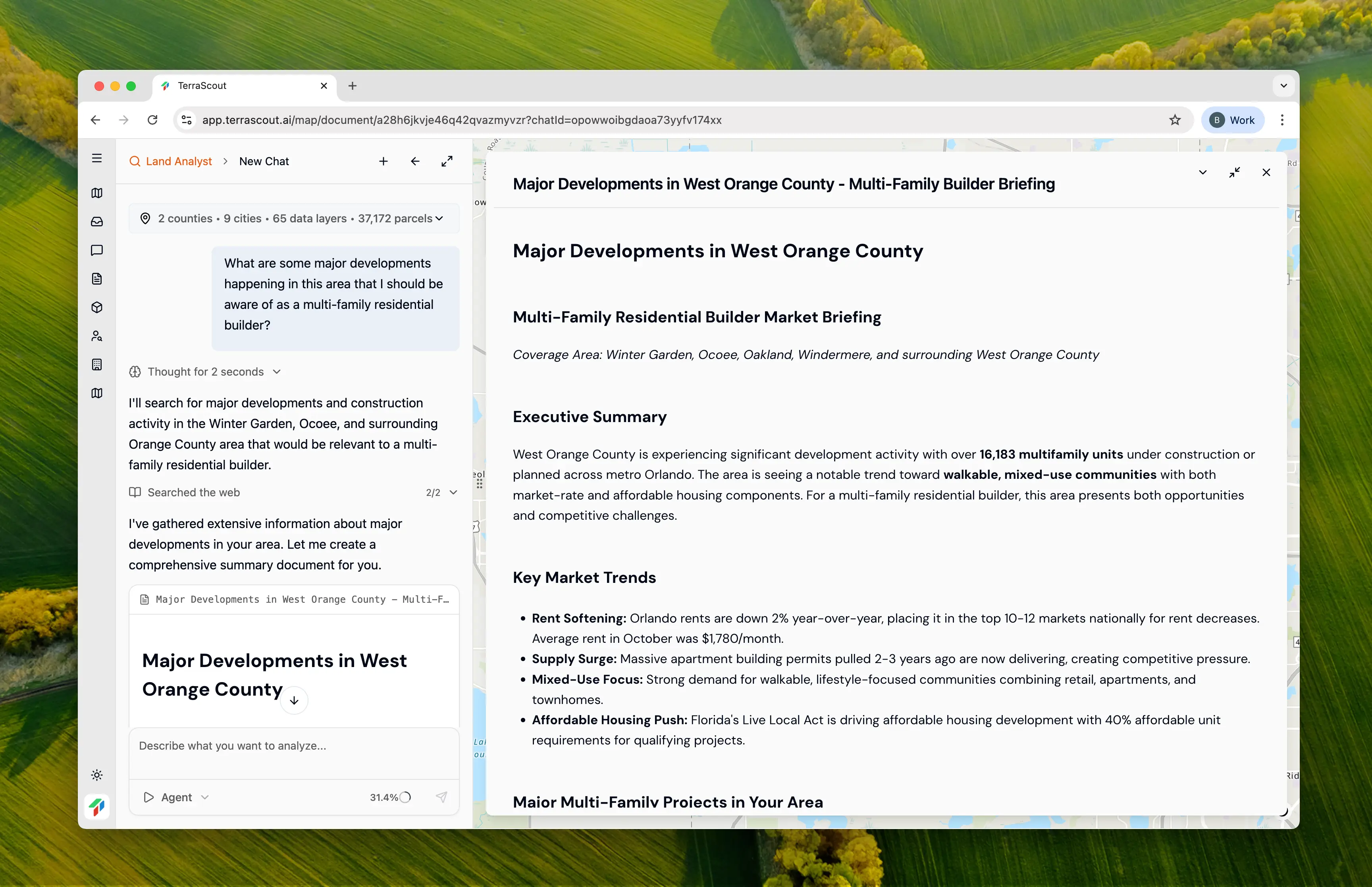 The agent is an expert at researching the web for detailed information. This isn’t basic keyword search. It understands context and finds relevant information that traditional search would miss. Combined with Ploti’s geospatial capabilities, you get market research that’s actually tied to the area you’re viewing on the map.How It Works