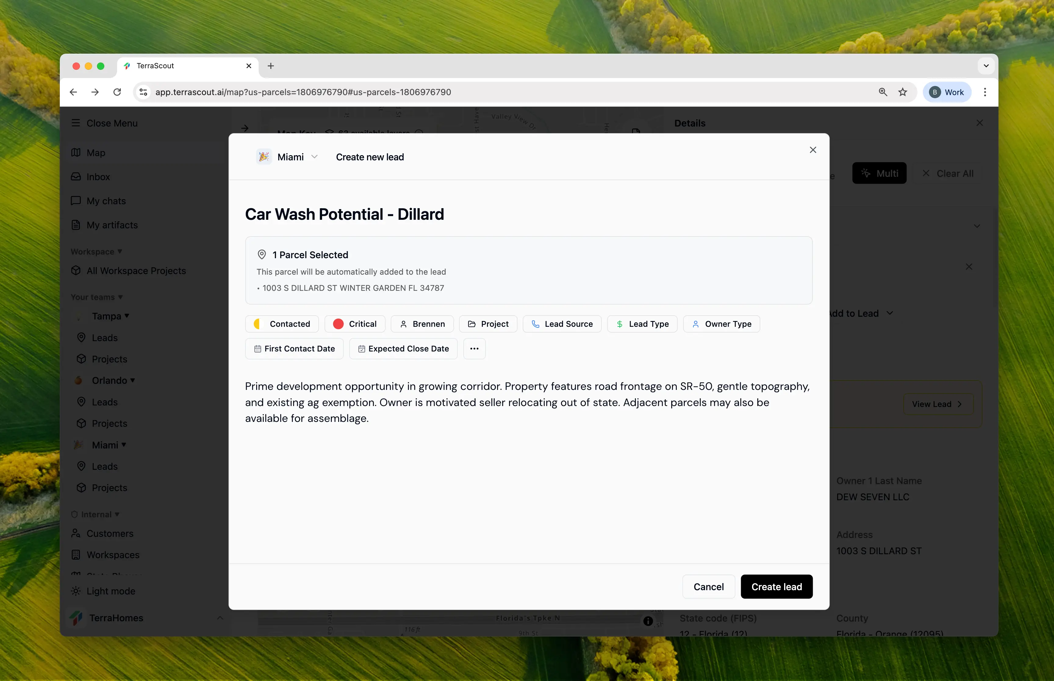- Click Create Lead in the parcel popup